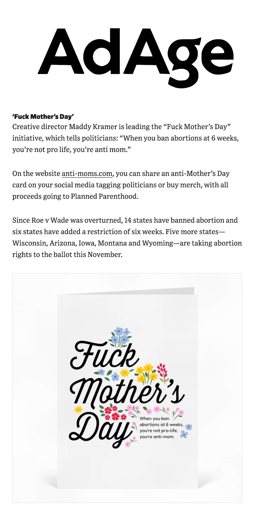 Since Roe v Wade was overturned, 14 states have banned abortion and six states have added restrictions of 6 weeks so during Mother’s Day, 2024 wanted to do something to make some noise of the awareness that a 6 weeks ban is not pro-life, but anti mom as most women don’t even know them are pregnant by week 6. So, we launched a website anti-moms.com where you can share an anti Mother's Day card on your social media where you can tag politicians against abortion, as well as buy merch that all the proceeds go to planned parenthood.